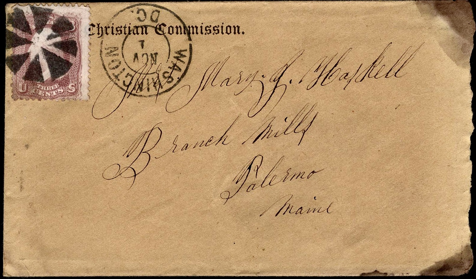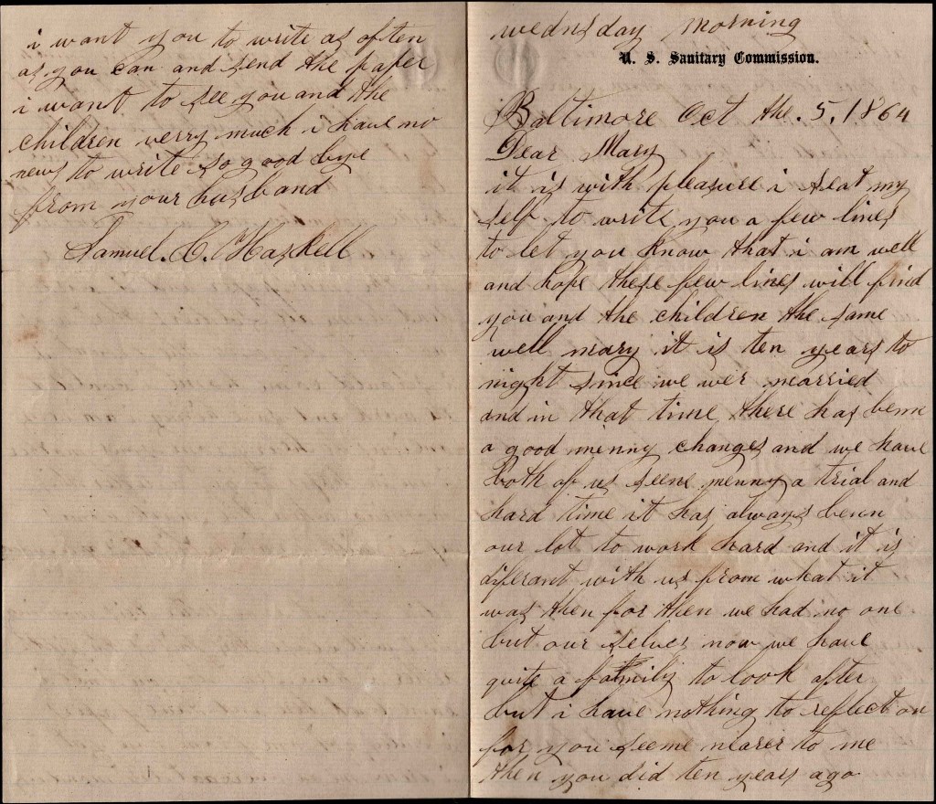 I did not get any letter this morning so I will close this. This is the fifth letter I have sent to you since I came back here and three papers. I only got one from you yet. I drew me an overcoat last Monday. I want you to write as often as you can and send the paper. I want to see you and the children very much. I have no news to write so goodbye from your husband, — Samuel C. Haskell