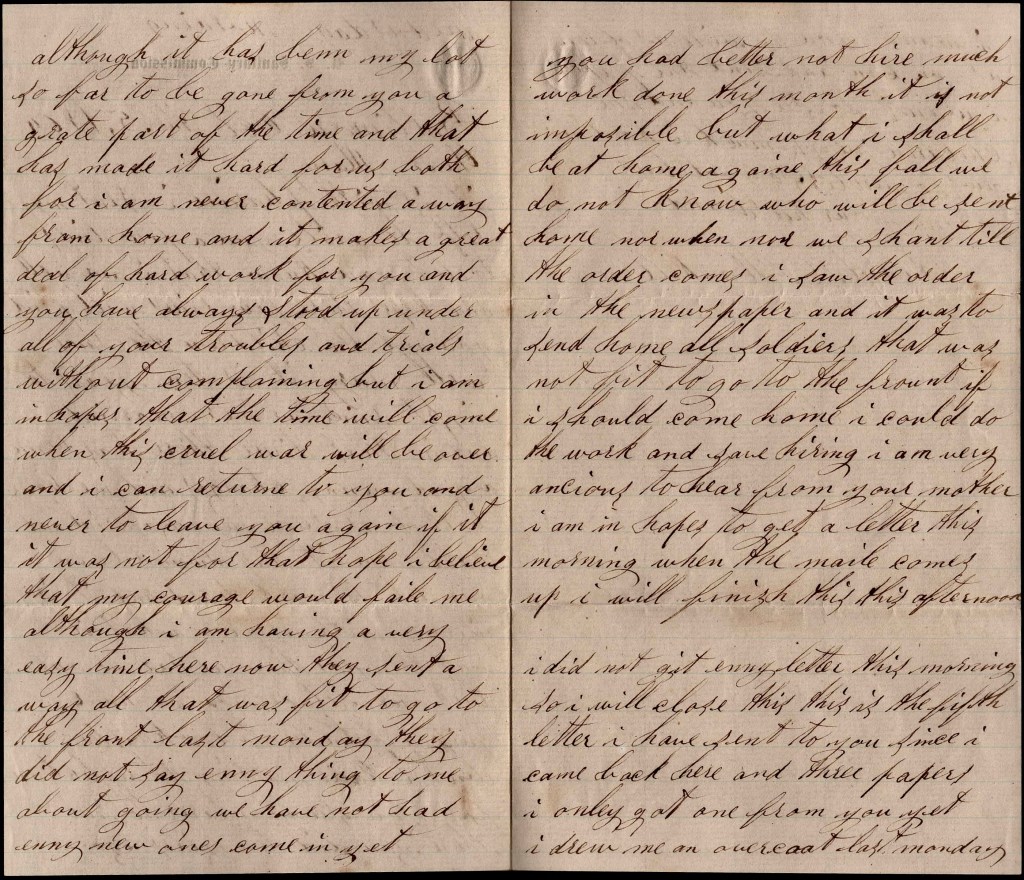 You had better not hire much work done this month. It is not impossible but what I shall be at home again this fall. We do not know who will be sent home nor when. Nor we shan’t till the order comes. I saw the order in the newspaper and it was to send home all soldiers that was not fit to go to the front. If I should come home, I could do the work and save hiring. I am very anxious to hear from your mother. I am in hopes to get a letter this morning when the mail comes up. I will finish this this afternoon.