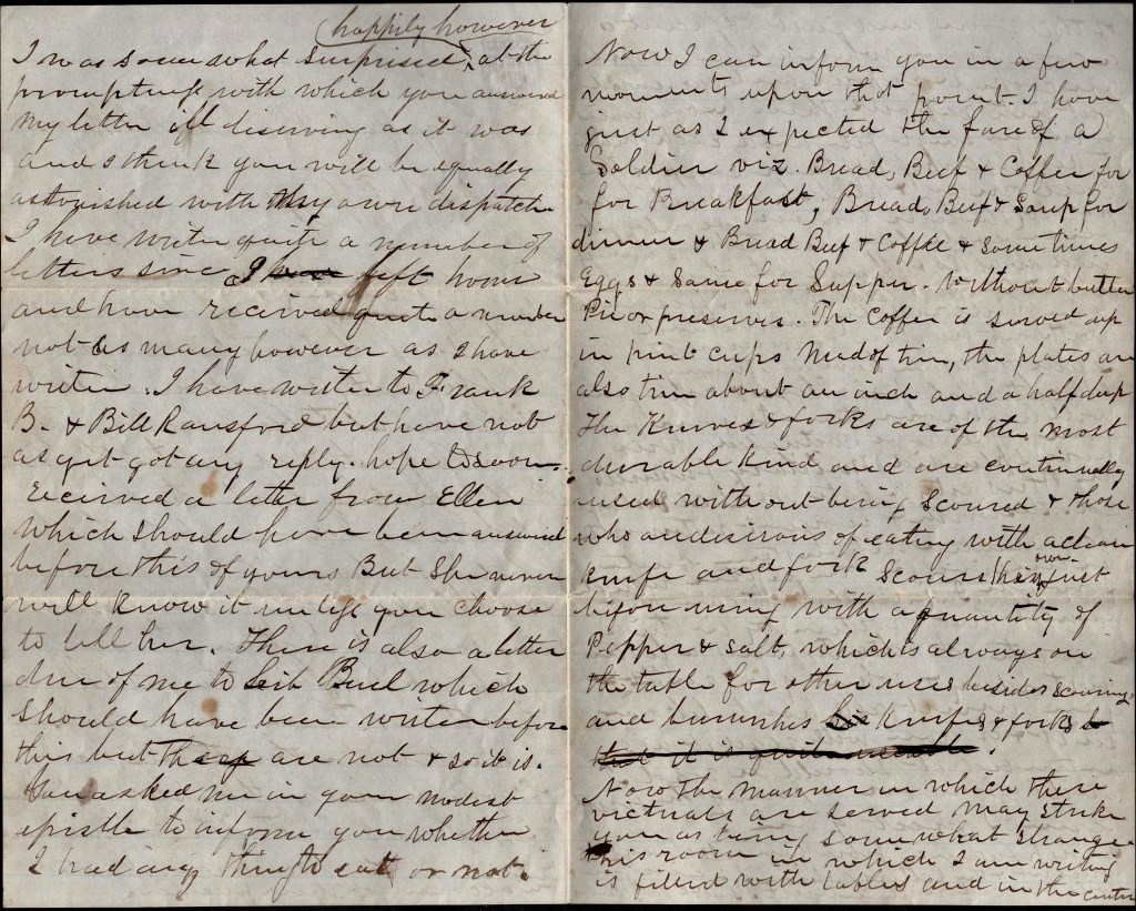 You asked me in your modest epistle to inform you whether I had anything to eat or not. Now I can inform you in a few moments upon that point. I have just as I expected the fare of a soldier—viz, Bread, Beef & coffee for Breakfast, Bread, Beef & soup for dinner, & Bread Beef & coffee & sometimes eggs and sauce for Supper, without butter, pie, or preserves. The coffee is served up in pint cups made of tin. The plates are also tin about an inch and a half deep. The knives & forks are of the most durable kind and are continuously used without being scoured & those who are desirous of eating with a clean knife and fork scours their own just before using with a quantity of pepper & salt, which is always on the table for other uses besides scouring and burnishes knife & forks. Now the manner in which these victuals are served may strike you as being somewhat strange. This room in which I am writing is filled with tables and in the center of this room and just adjacent is a cook room where all the victuals are cooked & prepared and measured out into rations. Then the companies form in single file and each man takes his cup of coffee or soup as the case may & his dish of meat, bread, potato (the latter, however, we only get once each day and that for dinner) and walks off and sits down at table, &c. This description I presume you will rapidly understand without further comments.