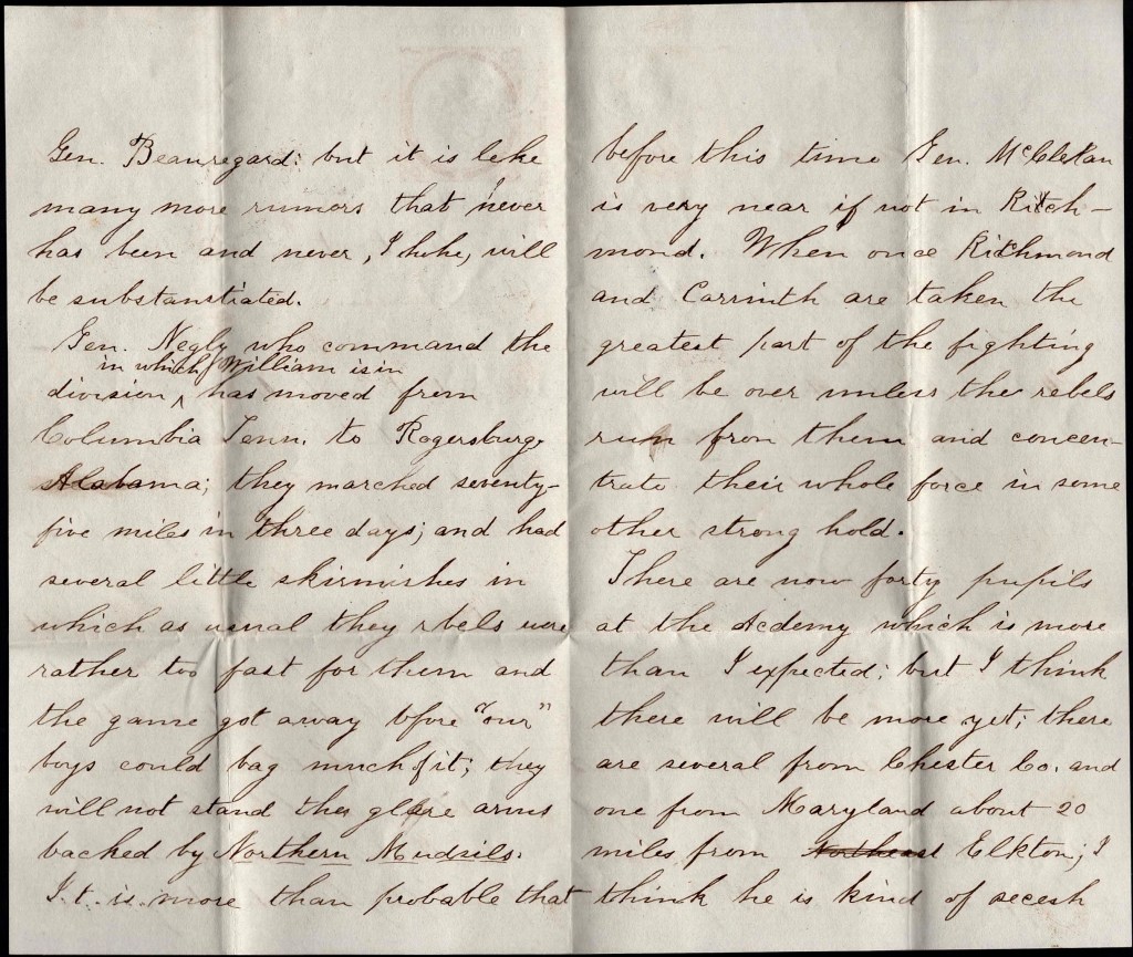 There are now forty pupils at the Academy which is more than I expected, but I think there will be more yet. There are several from Chester Co., and one from Maryland about 20 miles from Elkton. I think he is kind of secesh. He is a nephew of old Twadle. There is a Miss Adams from Chester Co. about six miles from Oxford. Irwin’s old forge I think. She appears to very much of a Lady.
