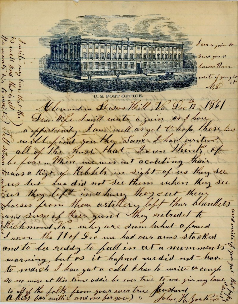 The following letter was written by John K. York who mustered into Co. H, 4th Maine Infantry on 9 November 1861. Two records in John’s pension file state that he died on 4 September 1862 from “wounds received in the neck” or “while engaged in battle with the enemy, he received a bayonet thrust in the neck and was sent to hospital and died from a wound and fever.” However, another affidavit, submitted by his captain, Albert L. Spencer, claims that John contracted a “Typhoid or Camp Fever” which was accompanied by a soreness in his throat and that he was sent to the hospital at David’s Island (NYC) about the 29th of June 1862 where he died on 4 September 1862. This claim is contradicted by Major Opdyke at David’s Island who says they treated John for a wound in the neck.