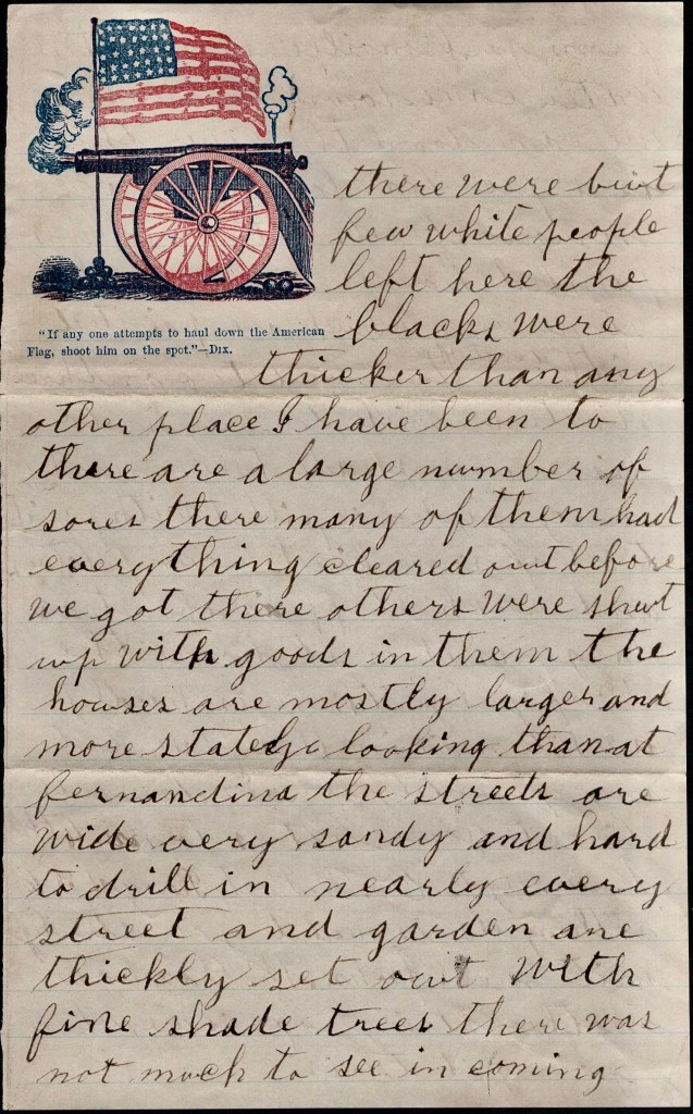 When we went to Fernandina, we were all well pleased for although it is not so large or wealthy a place as this place, or Jacksonville, yet there is something about it that seems more like our pleasant hills in New Hampshire. The buildings and land look much more like those at home. The streets are of good width, well laid out, and a little sandy with many fine shade trees. In going up the river to Jacksonville, interesting sights presented themselves all of the way. Most of the way the banks are thickly wooded. Now and then you see cleared spots with a few negro huts here. You always see the occupants with flags of some kinds raised and waving handkerchiefs and showing every demonstrations of joy. On a little farther you see a good building looking out from some remote spot among the trees—also the negro shanties scattered around it. At these places you generally see white women, but not a man, if any there be dare show their heads. Corn was just large enough to be plainly seen. All these things with the expectation of being saluted with a ball or shell kept up quite an excitement.