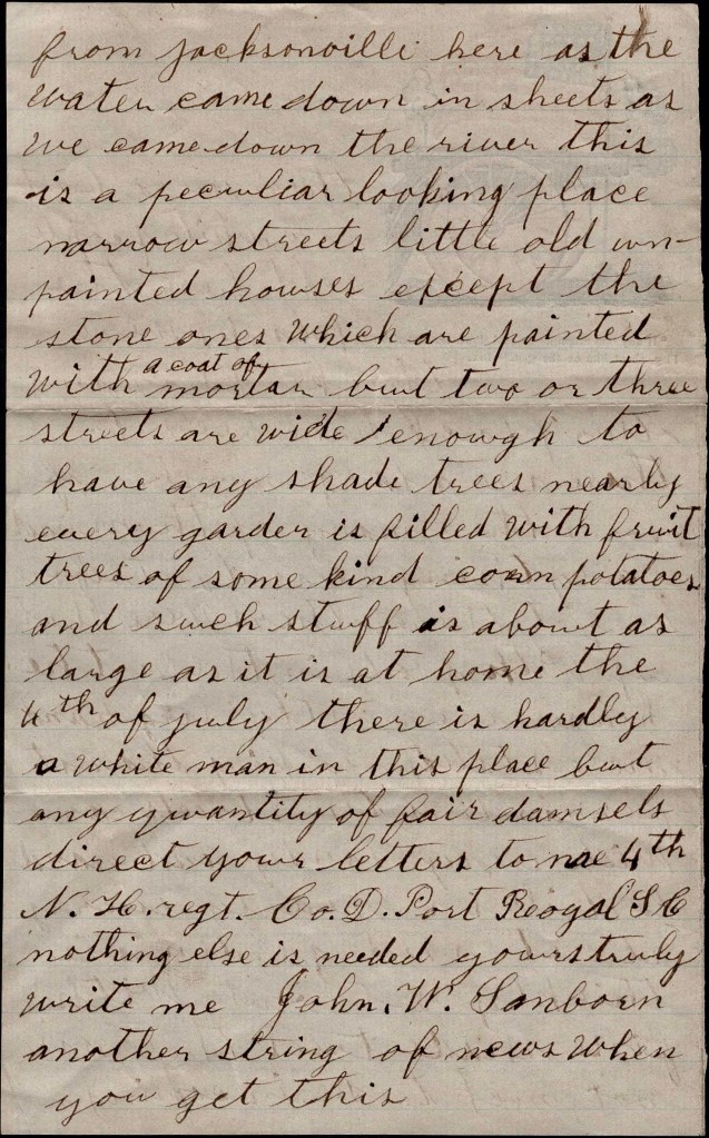 Direct your letters to me, 4th N. H. Regt., Co. D, Port Royal, S. C. Nothing else is needed. Yours truly, — John W. Sanborn