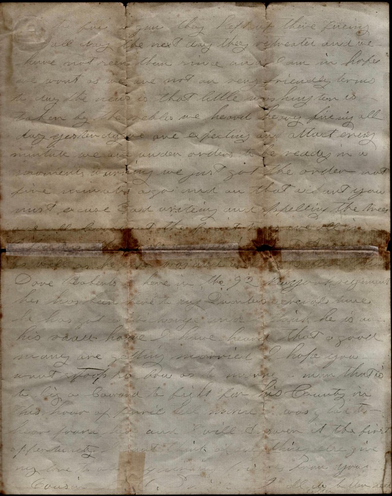 Today the news is that Little Washington is taken by the Rebels. We heard heavy firing all day yesterday. We are expecting an attack every minute. We are under orders to be ready in a moment’s warning. We just got the order not five minutes ago and on that account, you. must excuse bad writing and spelling.