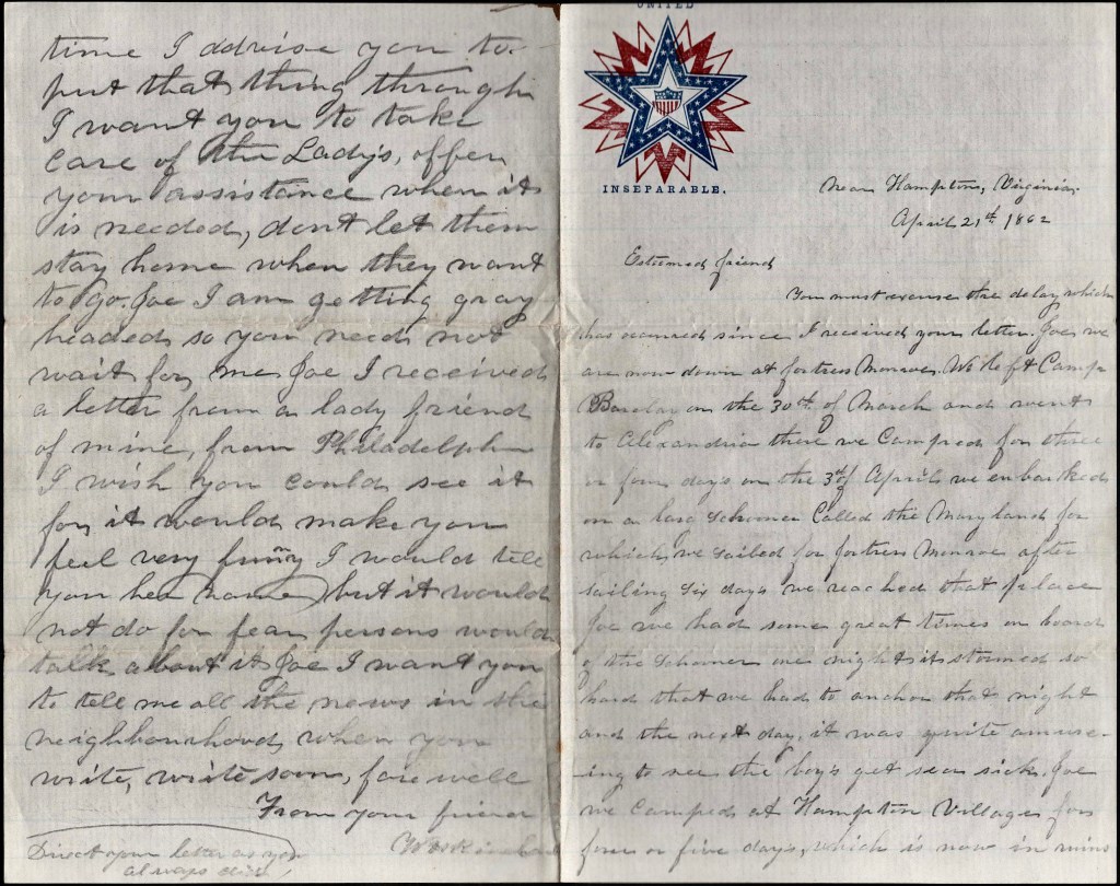 You must excuse the delay which has occurred since I received your letter. Joe, we are now down at Fortress Monroe. We left Camp Barclay on the 30th of March and went to Alexandria. There we camped for three or four days. On the 3rd of April we embarked on a large schooner called the Maryland for which we sailed for Fortress Monroe. After sailing six days we reached that place.