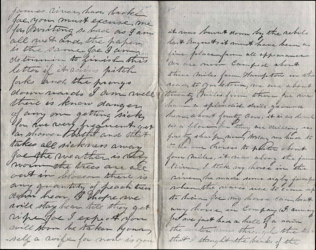 Joe, we have a splendid drill ground here [of] about forty acres. It is as level as a floor. Joe, they are drilling us pretty sharp now. Today we had to take our horses to pasture about four miles. It was along the James River. I took my horse in the river. He made some ugly jumps when the waves use to come up to him. Joe, my horse can beat any horse in Company I running. Joe, we just had a hell of a rain. The water run through the tent [such] that I thought the banks of the James river had broken. Joe, you must excuse me for writing so bad as I am all wet and the paper is the same.