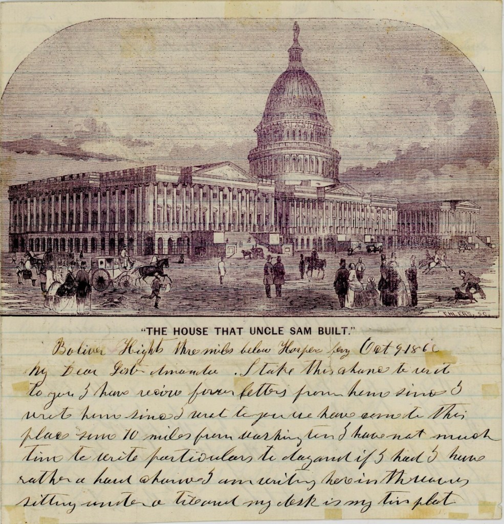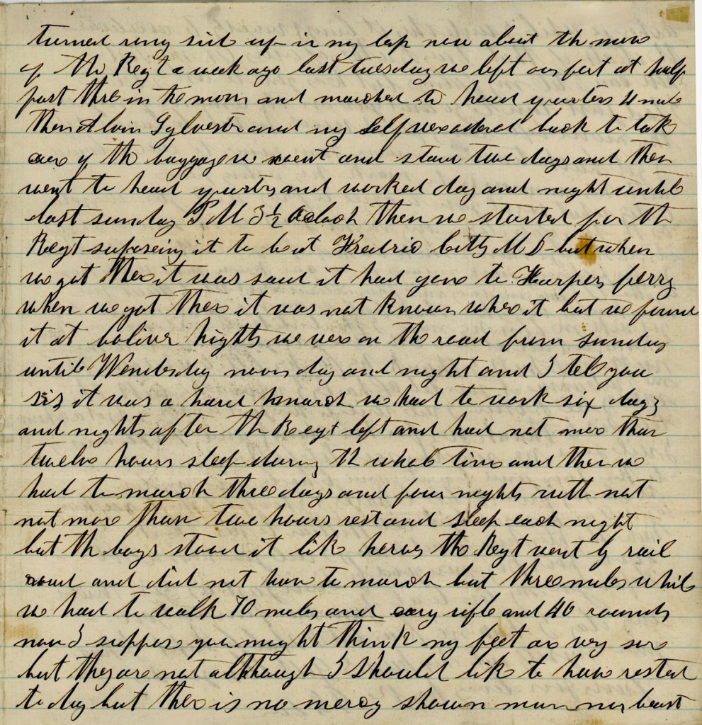 Now about the men of the regiment, a week ago last Tuesday we left our fort at half past three in the morn and marched to headquarters 4 miles. Then Alvin Sylvester 1 and myself were ordered back to take care of the baggage. Went and stayed two days and then went to headquarters and worked day and night until last Sunday p.m. 3.30 o’clock. Then we started for the regiment, supposing it to be at Frederick City, Maryland. But when we got there, it was said it had gone to Harpers Ferry. When we got there, it was not known where it was but we found it at Bolivar Heights. We were on the road from Sunday until Wednesday noon, day and night, and I tell you, Sis, it was a hard march. We had to work six days and nights after the regiment left and had not more than twelve hours sleep during the whole time and then we had to march three days and four nights with not more than two hours rest and sleep each night. But the boys stood it like heroes.