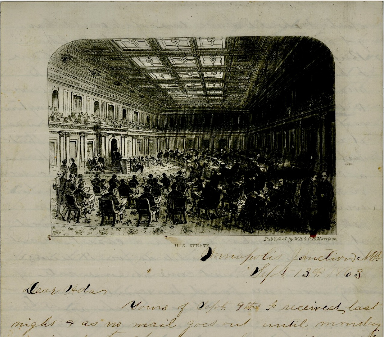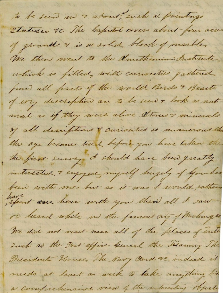 We saw lots of interesting things—much more than I can recollect to tell you. The night we got there we went to Canterberry Hall to a theatre but it had no great charms for me. When anything did for a moment please me, one thought of you would turn all to a joyless spectacle. Yesterday we visited the Capitol and went through the left wing. There are many interesting things to be seen in and about it such as paintings, statues, &c. the Capitol covers about four acres of ground and is a solid block of marble. We then went to the Smithsonian Institute which is filled with curiosities gathered from all parts of the world—birds and beasts of every description are to be seen & look as natural as if they were alive. Stones & minerals of all descriptions & curiosities so numerous that the eye becomes tired before you have taken the first survey. I should have been greatly interested & enjoyed myself hugely if you had been with me but as it was, I would rather have spent one hour with you than all I saw or heard while in the famous City of Washington.