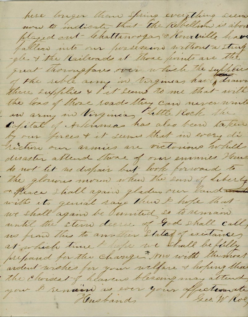 Little Rock, the Capitol of Arkansas, has also been taken by our forces & it seems that in every direction our armies are victorious while disaster attends those of our enemies. Hence, do not despair but look forward to the glorious morn when the sun of Liberty & Peace shall again gladden our land with its genial rays. Then I hope that we shall again be united so to remain until the stern decree of God shall call us from this to another state of existence at which time I hope we shall be fully prepared for the change.