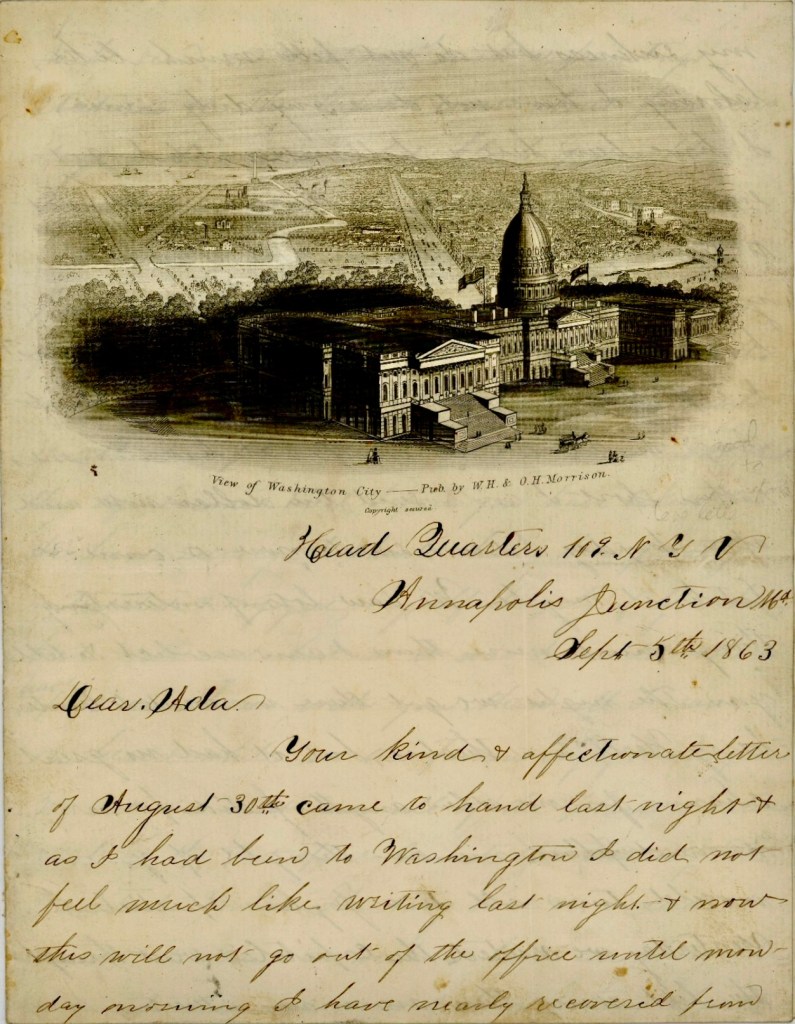 Your kind & affectionate letter of August 30th came to hand last night and as I had been to Washington I did not feel much like writing last night & now this will not go out of the office until Monday morning. I have nearly recovered from my sickness but do not feel much like laboring. I have not done any duty since I have been here & shall not until I get entirely over the sickness.