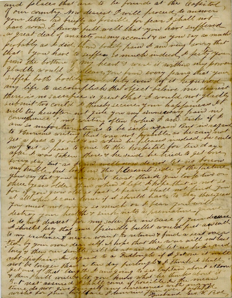 But in regard to Harrison [Tompkins] writing, that was not possible as he cannot get a pass to go out & in when he pleases. Indeed, he could not get a pass to come to the hospital for ten days after I was taken there & he said he tried to get one every day. But as I am well now, do not let us borrow any trouble but look on the pleasant side of the picture. You say that you are or at least think you look two or three years older than when I left. I hope that is not so for if you grow old so fast I fear I shall not find you at all when I come home if I should have to stay three years. You must not worry so much or I fear you will destroy your health & sink into a premature grave. So do not, dearest, for my sake, for in case of your decease, I should pray that some friendly bullet would put an end to my existence. I never want to return & find a seat vacated by your own dear self. I hope that the war will not last long & then our troubles will be at an end. Let us hope and not despair.