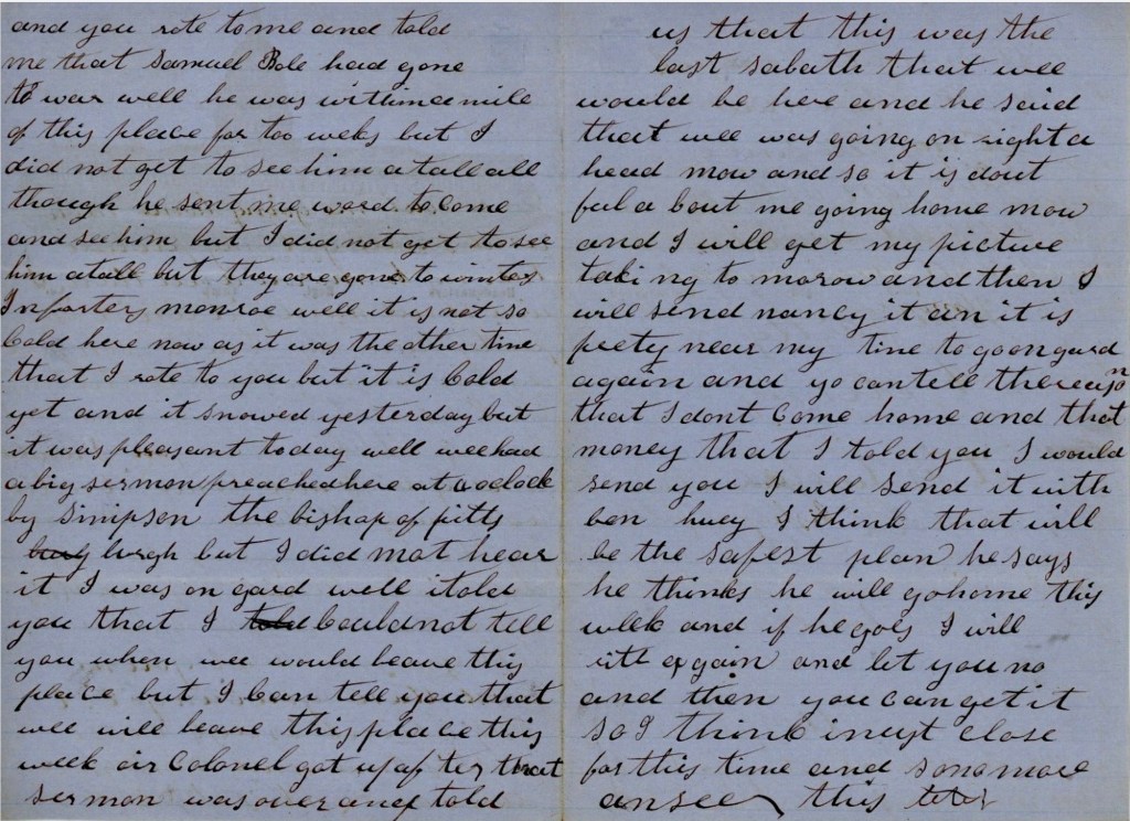 Well, it is not so cold here now as it was the other time that I wrote to you but it is cold yet and it snowed yesterday. But it was pleasant today. We had a big sermon preached here at 4 o’clock by [Matthew] Simpson, the Bishop of Pittsburgh, but I did not hear it. I was on guard. I told you that I could not tell you when we would leave this place but I can tell you that we will leave this place this week. Our colonel got up after that sermon was over and told us that this was the last Sabbath that we would be here and he said that we was going on right ahead now and so it is doubtful about me going. home now.