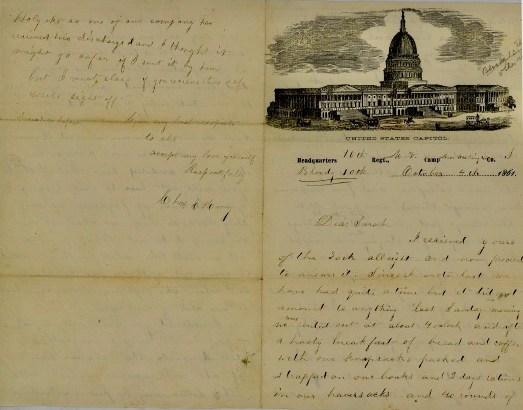 This letter was written by Charles E. Hovey (1843-1863) who enlisted on 21 June 1861 to serve three years in Co. I, 10th Massachusetts Infantry. He was with his regiment until the Battle of Chancellorsville where he was mortally wounded and died on 3 May 1863. Before his enlistment, Charles was employed making envelopes in a factory at Holyoke, Massachusetts.