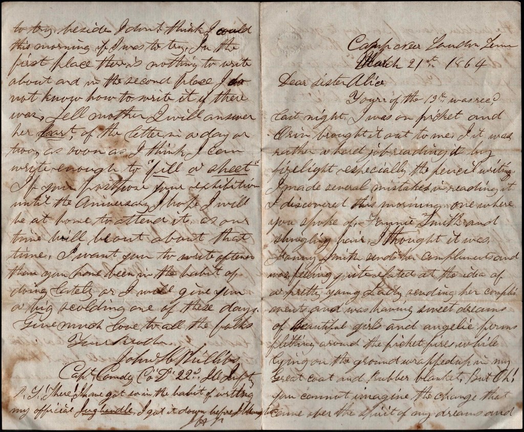 This letter was written by John Howell Phillips (1832-1876) from the camp of the 22nd Illinois Infantry in March 1864 while serving as Captain of Co. D. There were 27 of his letters ranging in date from January 8, 1862 to May 24, 1865 sold at auction in 2015. It isn’t clear if this was one of them or not. They were all written to his mother or sister Alice (“Allie”). They were datelined from Corinth, Camp Lyon, Florence [Alabama], Nashville, Murfreesboro, Stone River, Bayou Pierre [Mississippi], Bridgeport [Alabama], Cairo [Illinois] and others.