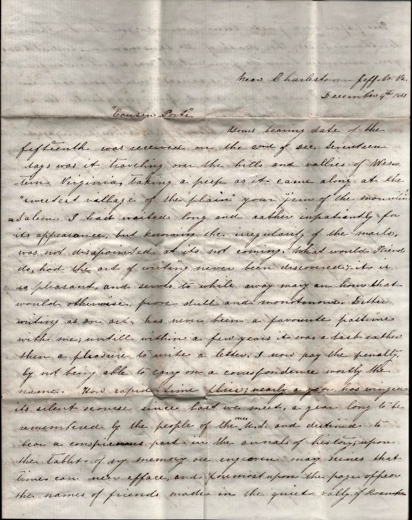 Yours bearing date of the fifteenth was received on the 2nd of December. Seventeen days was it traveling over the hills and valleys of Western Virginia, taking a peep as it came along at the “sweetest village of the plain” your “gem of the mountain” = Salem. I had waited long and rather impatiently for its appearance, but knowing the irregularity of the mails, was not disappointed at its not coming. What would friends do had the art of waiting never been discovered? It is so pleasant and serves to wile away many an hour that would otherwise prove dull and monotonous. Letter writing as an art has never been a favorite pastime with me until within a few years it was a task rather than a pleasure to write a letter. I now pay the penalty by not being able to carry on a correspondence worthy the name. How rapid time flies; nearly a year has winged its silent course since last we met—a year long to be remembered by the people of the once United States and destined to bear a conspicuous part in the annals of history; upon the tablet of my memory are engraven many scenes that times can ne’er efface, and foremost upon the pages appear the names of friends made in the quiet valley of Roanoke.