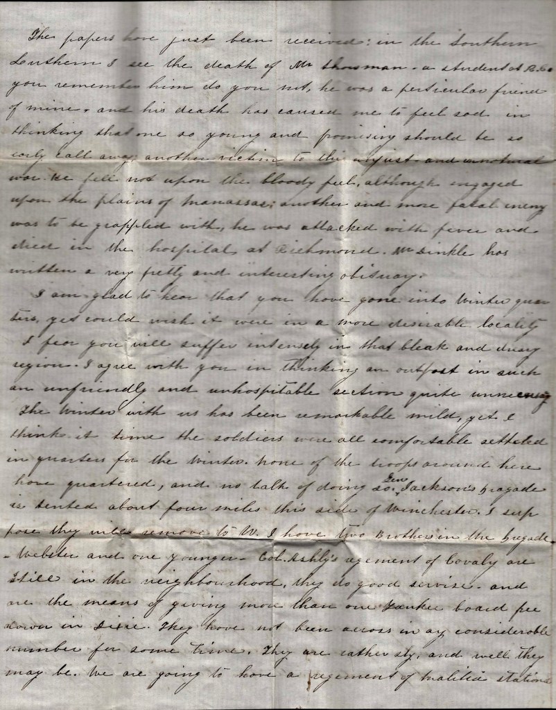 I am glad to hear that you have gone into winter quarters, yet could wish it were in a more desirable locality. I fear you will suffer intensely in that black and dreary region. I agree with you in thinking an outpost in such an unfriendly and unhospitable section quite unnecessary. The winter with us has been remarkable mild, yet I think it time the soldiers were all comfortable settled in quarters for the winter. None of the troops around here have quartered and no talk of doing so. Gen. [Stonewall] Jackson’s Brigade is tented about four miles this side of Winchester. I suppose they will remove to Winchester. I have two brothers in the Brigade—Webster and one younger. Col. [Turner] Ashby’s regiment of cavalry are still in the neighborhood. They do good service and are the means of giving more than one Yankee [his] board free down [here] in Dixie. They have not been across in any considerable number for some time. They are rather sly and well they may be. We are going to have a regiment of militia stationed in Charlestown for the winter. I am sorry they are going to be in there, so many of them are addicted to the disgusting habit of intemperance it makes it unsafe to go there.