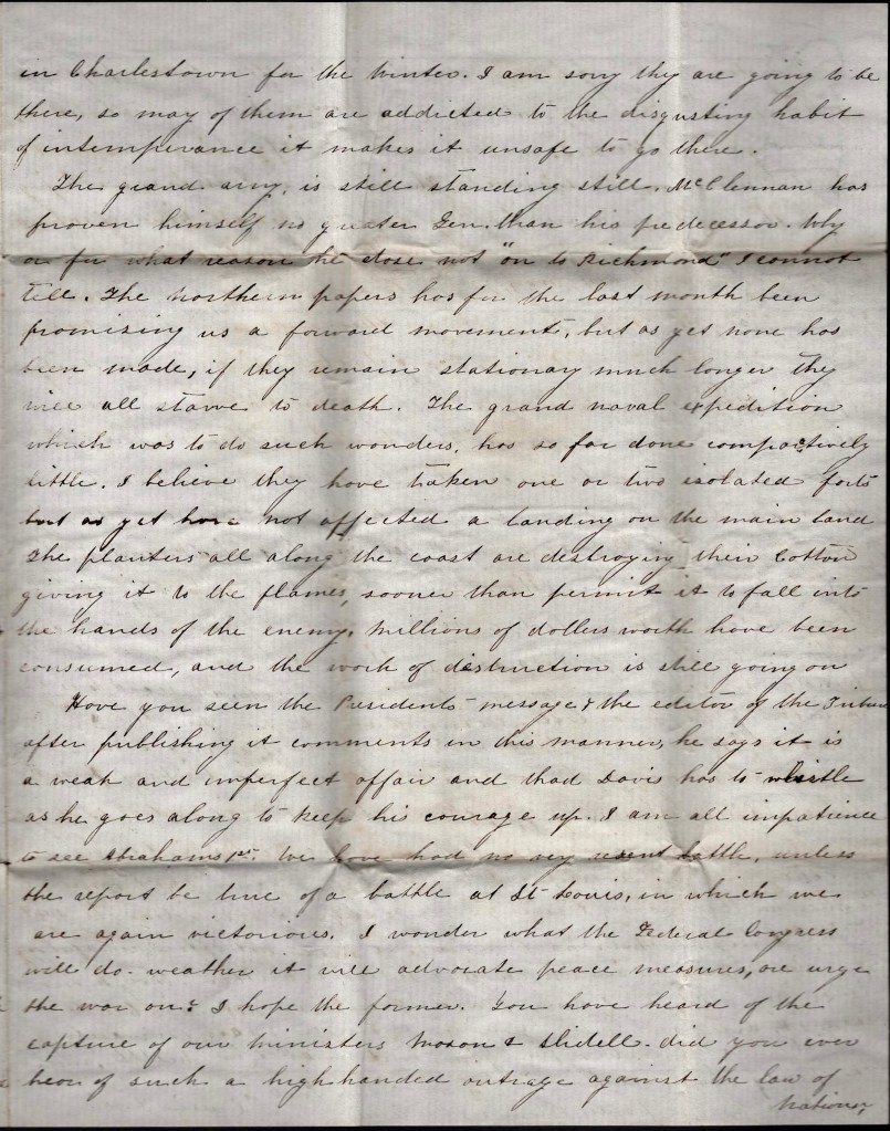 The grand army is still standing still. McClellan has proven himself no greater general than his predecessor. Why or for what reason he does not “On to Richmond” I cannot tell. The Northern papers has for the last month been promising us a forward movement but as yet none has been made. If they remain stationary much longer, they will starve to death. The grand naval expedition which was to do such wonders has so far done comparatively little. I believe they have taken one or two isolated forts but as yet have not effected a landing on the main land. The planters all along the coast are destroying their cotton, giving it to the flames, sooner than permit it to fall into the hands of the enemy. Millions of dollars worth have been consumed and the work of destruction is still going on.