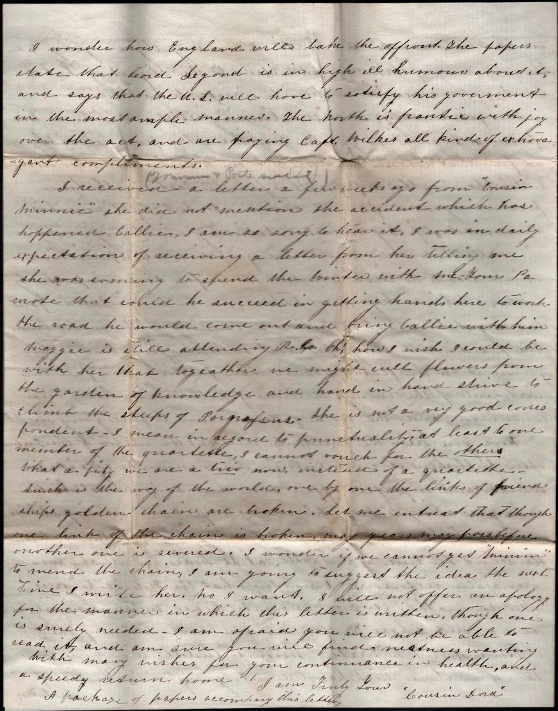 I received a letter a few weeks ago from “Cousin Minnie.” She did not mention the accident which has happened [to] Callie. I am so sorry to hear it. I was in daily expectation of receiving a letter from her telling me she was coming to spend the winter with me. Your Pa wrote that could he succeed in getting hands here to work the road, he would come out and bring Callie with him. Maggie is still attending the Roanoke College. Oh! how I wish I could be with her that together we might cull flowers from the garden of knowledge and hand in hand strive to climb the steeps of Parnassus. She is not a very good correspondent—I mean in regard to punctuality, at least to one member of the quartet. I cannot vouch for the others. What a pity we are a trio now instead of a quartet. Such is the way of the world. One by one the links of friendships golden chain are broken. Let me entrust that though one link of the chain is broken, may years pass before another one is severed. I wonder if we cannot get “Minnie” to mend the chain? I am going to suggest the idea the next time I write her.