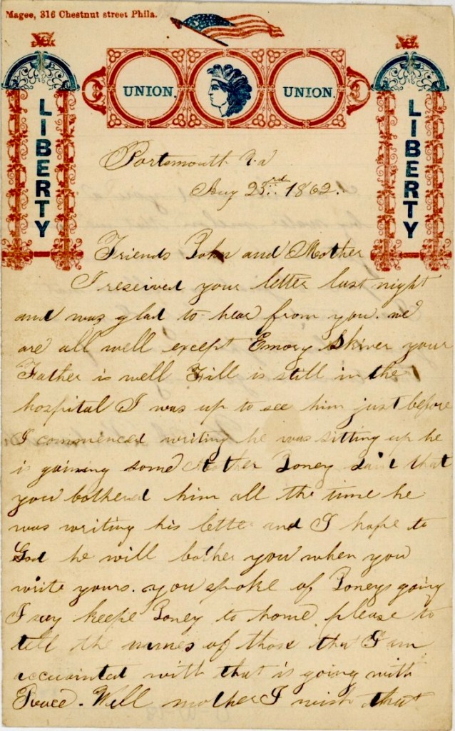 This letter was written by William Almon Wilmarth (1838-1914) of Co. H, 58th Pennsylvania Infantry. William enlisted in December 1861 and mustered out of the service in December 1864. An obituary informs us that during “the winter of 1863 at Little Washington, N.C., he was detailed as guard on a government transport about three months and in the spring of 1863 he was attached to Co. M, 4th US Art., about two months. On June 4, 1864, at Cold Water, Va., he received a gunshot wound in right leg and was in a hospital at Point Lookout, Md., about four weeks with fever and ague. He took part in the battles of Norfolk, Gum Swamp, Sandy Ridge, Drewry’s Bluff, Cold Harbor and Fort Harrison, Va.”