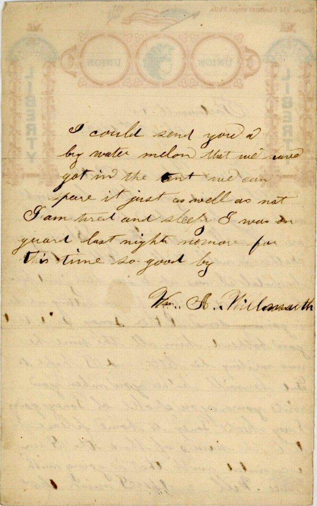 Well, Mother, I wish that I cuold send you a big water melon tat we have got in the tent. We can spare it just as well as not. I am tired and sleepy. I was on guard last night. No more for this time. So goodbye. — Wm. A. Willmarth