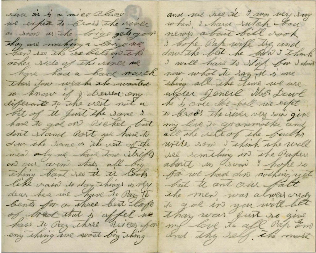 It looks like rain today. Things is very dear here. We have to pay 15 cents for a three-cent loaf of bread. That is awful. We have to pay three prices for anything we want big thing and we see it. I was very sorry when I heard such bad news about Bill Rook. I hope Pap will try and do the best he can. I think I will have to stop for I don’t know what to say. It is one thing all the time. We are under General McDowell. He is over McColl. We expect to cross the river very soon.