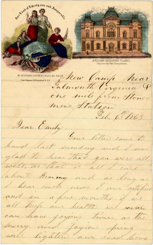 James was one of the first in his county to enlist in Co. C of the 1st Pennsylvania Infantry, serving from 20 April 1861 to 24 July 1861. A year later, he re-enlisted in Co. K, 129th Pennsylvania Infantry—a 9 month organization—from 11 August 1862 to 18 May 1863. It was while serving in the 129th that he wrote this letter from their camp near Stoneman’s Station in Virginia. It was several weeks following the Battle of Fredericksburg in which the regiment lost 142 in killed and wounded. In less than a month they would participate in the Battle of Chancellorsville though their losses would be fewer and most that remained were able to return home as their time expired.