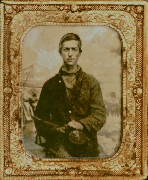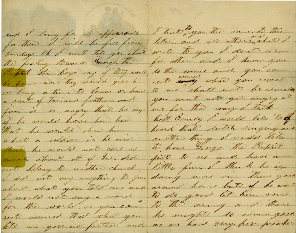 Oh! I must tell you about the feeling towards “George” the Baptist. The Boys say if they would be home now, they would give him so long a time to leave or have a coat of tar and feathers. And Jim is so angry that he says if he would have him hear that he would show him what a soldier is. He said that he would not care so much about it if “Sue” [?] did not belong to another church. I did not say anything to Jim about what you. told me and I would not say a word for the world so you can rest assured that what you tell me goes no further and trust to you the same to this letter and all others. What I write to you, I don’t mean for others, and I know you do the same. And you can rest assured what you reveal to me shall not be revealed. You must not get angry at me for the way I talk.