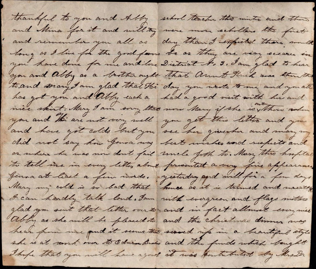 Mary, my cold is so bad that I can hardly talk loud. I am glad you sent that letter over to Abby as she will be pleased to hear from me and it seems that she is at work over to Edwin Bushes. I hope that you will have a good school teacher this winter, and there were more scholars the first day than I expected there would be as they are very scarce in District No. 3. I am glad to hear that Aunt Rush was there that day you wrote to me and you all had a good visit with her and now Mary, if she is out there when you get this letter and you see her, give her and Mary, my best wishes and respects and Uncle Josh too.