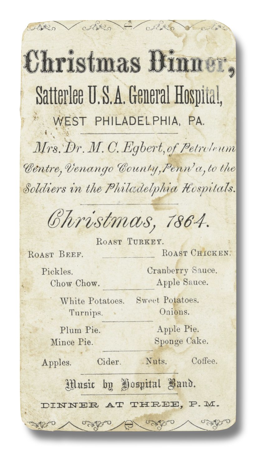 John’s letter was written from Satterlee Hospital in Philadelphia. He complains of a cold and sore throat—not symptoms that would warrant hospitalization so he must have been recuperating from something more chronic or perhaps he was detailed there to work as a hospital aide. He doesn’t say and the regimental roster only tells us he was “discharged with detachment, May 17, 1865 at Satterlee Hospital.” There isn’t much war news in the letter but there is a good description of the holiday decorations at the hospital and of the Christmas dinner provided the soldiers in Philadelphia hospitals by the generous donation of Dr. & Mrs. M. C. Egbert. [See: The American Menu]