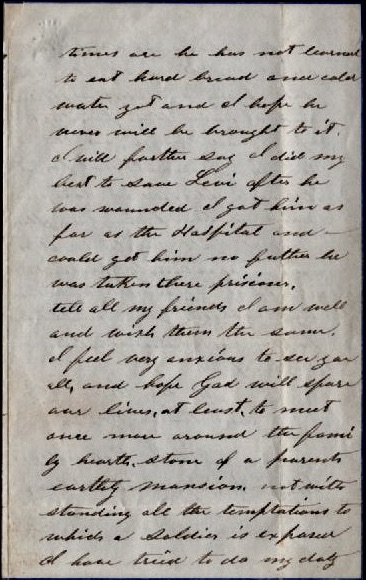 I will further say I did my best to save Levi after he was wounded. I got him as far as the Hospital and could get him no further. He was taken there prisoner. Tell all my friends I am well and wish them the same. I feel very anxious to see you all and hope God will spared our lives, at least, to meet once more around the family hearth stone of a parent’s earthly mansion, not withstanding all the temptations to which a soldier is exposed. I have tried to do my duty. Keep soberness and truth on my side, and the good will of my commanding officers and I have thus far kept up a good name in the regiment.