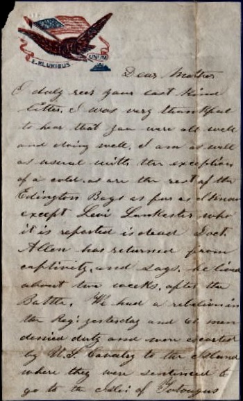 I duly rec’d your last kind letter. I was very thankful to hear that you were all well and doing well. I am as well as usual with the exception of a cold, as are the rest of the Eddington Boys as far as I know except Levi Lancaster who it is reported is dead. Doctor [W. H.] Allen has returned from captivity and says he lived about two weeks after the battle. 1