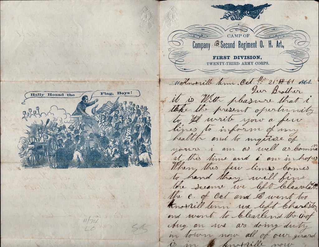 We left Cleveland the 9th of October and went to Knoxville, Tennessee. We left Charleston [TN] and went to Cleveland [TN] the 4th of August and we are doing duty in town now. All of our guard is in Knoxville now. The Boys is well as a general thing and in good spirits. I han’t heard from John Renard since we left Cleveland and he was with his company then, but not well. He is at Loudon now.