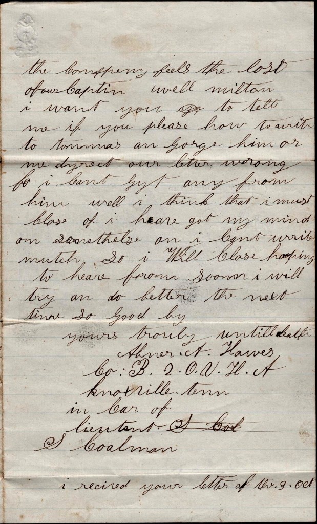 Well Milton, I want you to tell me, if you please, how to write Thomas and George. [Either] him or me directed our letters wrong for I can’t get any from him. Well, I think that I must close off. I have got my mind on something else and I can’t write much, so I will close hoping to hear from [you] soon. I will try and do better the next time. So goodbye. Yours truly until death, — Abner A. Hawes, Co. B., 2nd 0. V. H. A., Knoxville, Tenn. In care of Lieutenant S. Coleman.
