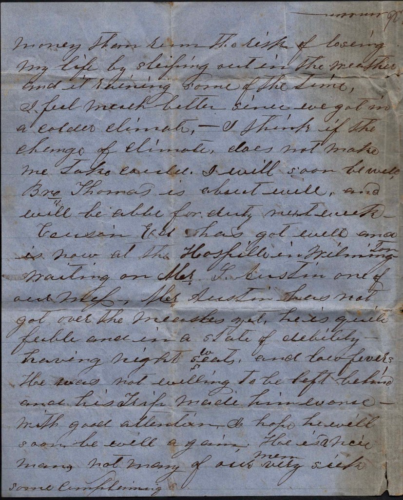 Bro. Thomas is about well and will be able for duty next week. Cousin Ed has got well and is now at the hospital at Wilmington waiting on Mr. J[ames M.] Austin—one of our mess. Mr. Austin has not got over the measles yet. He is quite feeble and in a state of debility, having night sweats and low fevers. He was not willing to be left behind and his trip made him worse. With good attention I hope he will soon be well again. He is a nice man. Not many of our men are very sick. Some complaining.