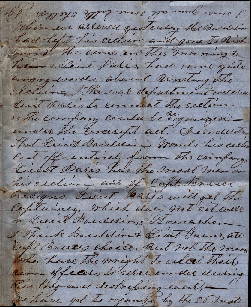 When we arrived yesterday, Mr. [Wood] Bouldin had left his section and gone to Richmond. He came in this morning & Lieut. [Andrew B.] Paris had some quite angry words about uniting the sections. The War Department ordered Lieut. Paris to connect the section so the company could be organized under the Conscript Act. I understand that Lieut. Bouldin wants his section cut off entirely from the company. Lieut. Paris has the most men in his section and if Capt. [Charles] Bruce resigns, Lieut. Paris will get the captaincy which does not sit well on Lieut. Bouldin’s stomach. I think Bouldin & Lieut. Gain are Capt. Bruce’s choice, but not the men who have the right to select their own officers to serve under during this long and distressing war.