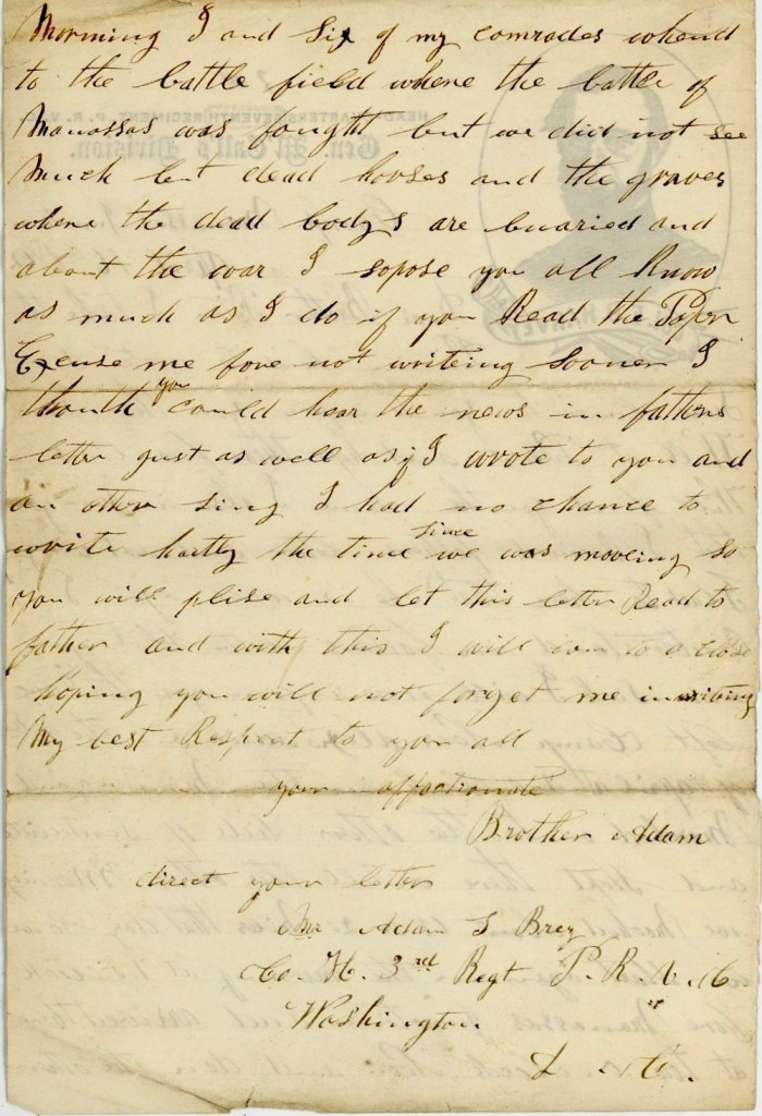 Direct your letter to Mr. Adam S. Brey, Co. H, 3rd Regt. P. R. V. C., Washington D.C.