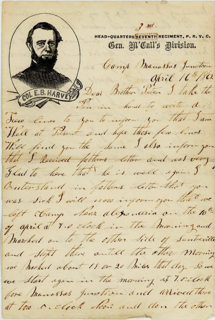 I will now inform you that we left camp near Alexandria on the 10th of April at 7 o’clock in the morning and marched to the other side of Centerville and slept there until the other morning. We marched about 18 or 20 miles that day so we start again in the morning at 7 o’clock for Manassas Junction and arrived there at two o’clock noon. And then the other morning I and six of my comrades went to the battlefield where the Battle of Manassas was fought but we did not see much but dead horses and the graves where the dead bodies are buried.