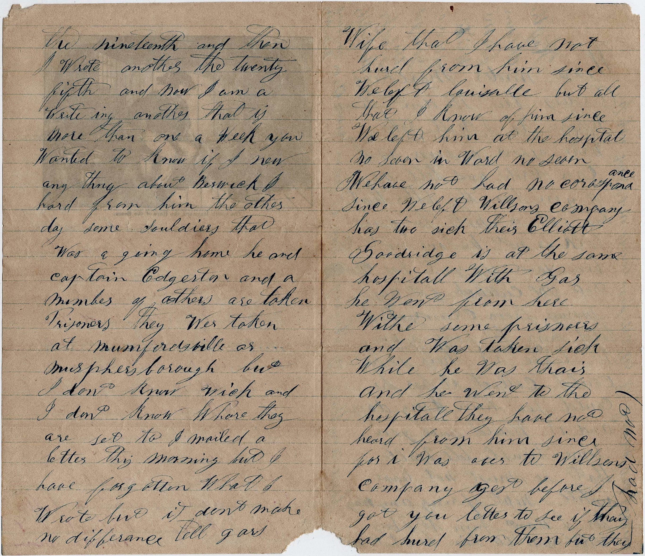 You wanted to know if I knew anything about Berwick. I heard from him the other day. Some soldiers that was a going home. He and Captain Edgerton and a number of others are taken prisoners. They were taken at Mumfordsville or Murfreesboro but I don’t know which and I don’t know where they are sent to. I mailed a letter this morning but I have forgotten what I wrote but it don’t make no difference. Tell Gars’ [Eben W. Garzee] wife that I have not heard from him since we left Louisville but all that I know of him since. We left him at the hospital No. 7 in Ward No. 7. We have not had no correspondence since we left. [William] Wilson’s Company [A] has two sick there. [George] Elliott Goodrich is at the same hospital with Gar [Garzee]. He went from here with some prisoners and was taken sick while he was there and he went to the hospital. They have not heard from him since for I was over to Wilson’s Company just before I got your letter to see if they had heard from them but they had not.