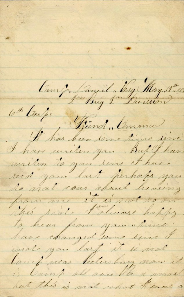 It has been some time since I have written you. But I have written to you since I have received your last. Perhaps you do not care about hearing from me. It is not so on this side. I am always happy to hear from you. “Times” have changed some since I wrote you last. It is not “Camp near Petersburg” now, It is camp all over Virginia a most. But this is not what I was a writing about. I wrote to you just before we broke camp and sent you my picture. Did you ever get it? I have not heard from you since but some of our mail has been thrown away while we were on the last campaign.