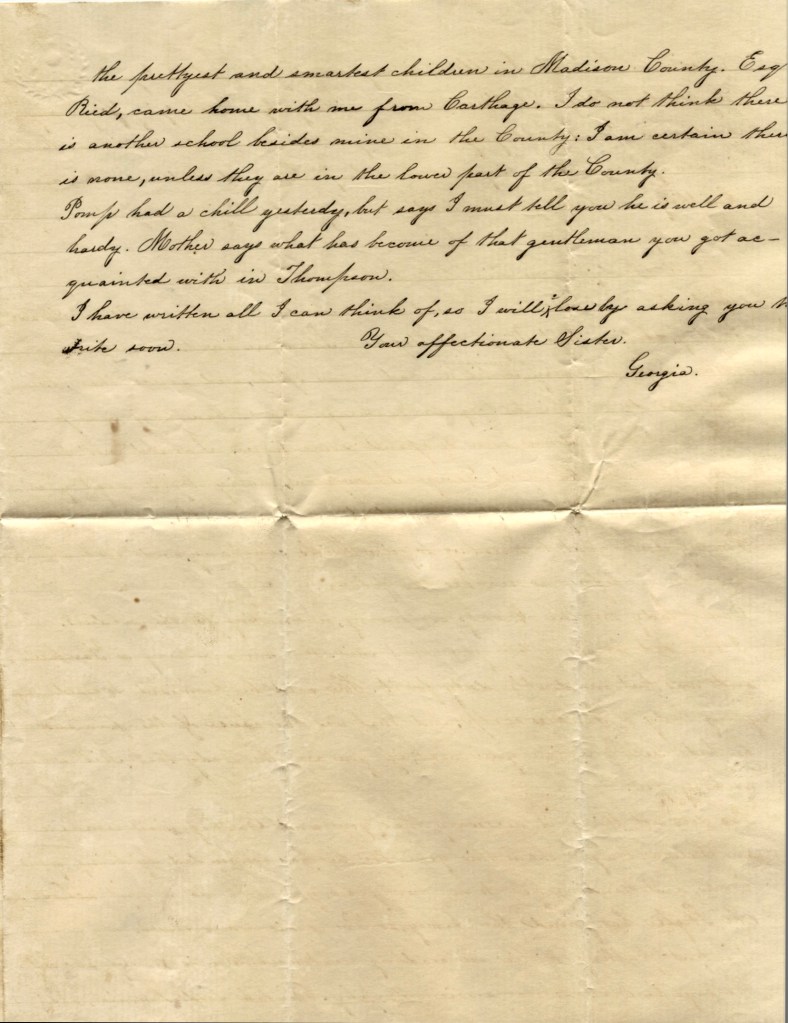 I have written all I can think of so I will close by asking you to write soon. Yours affectionate sister, — Georgia