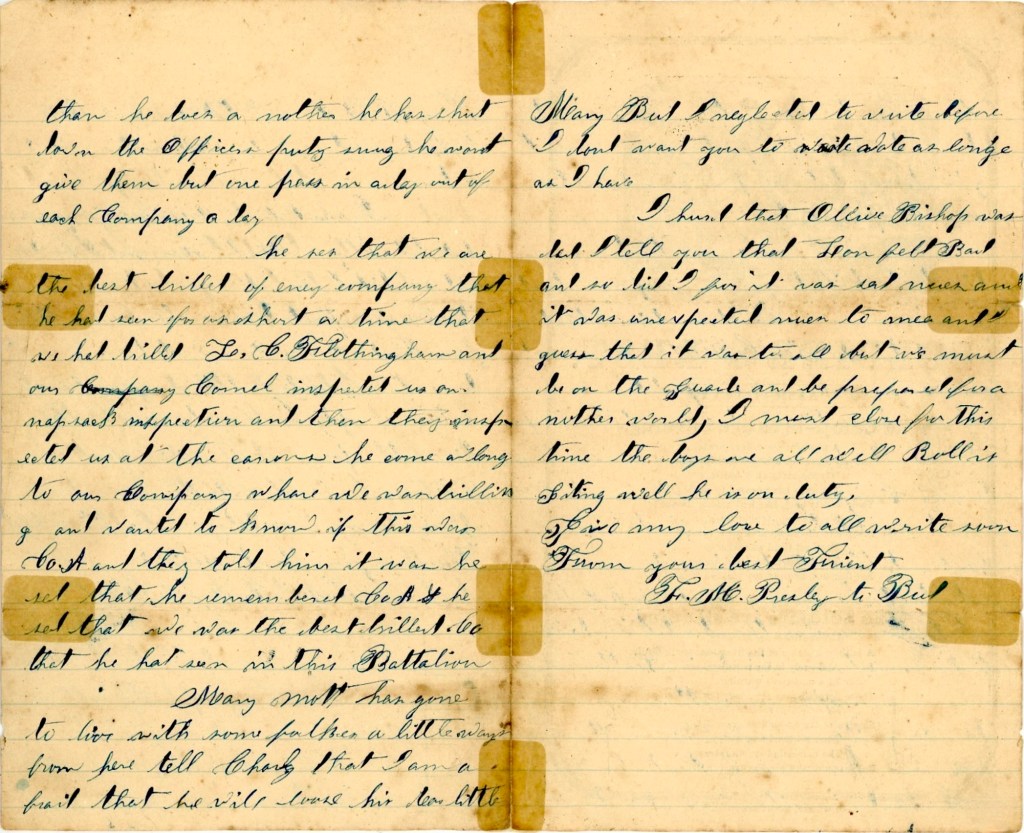 I heard that Olive Bishop was dead. I tell you that Lon felt bad and so did I for it was sad news and it was unexpected news to me and I guess that it was to all. But we must be on the guard and be prepared for another world. I must close for this time. The Boys are all well. Roll is getting well. He is on duty. Give my love to all. Write soon. From your best friend, — F. M. Presley