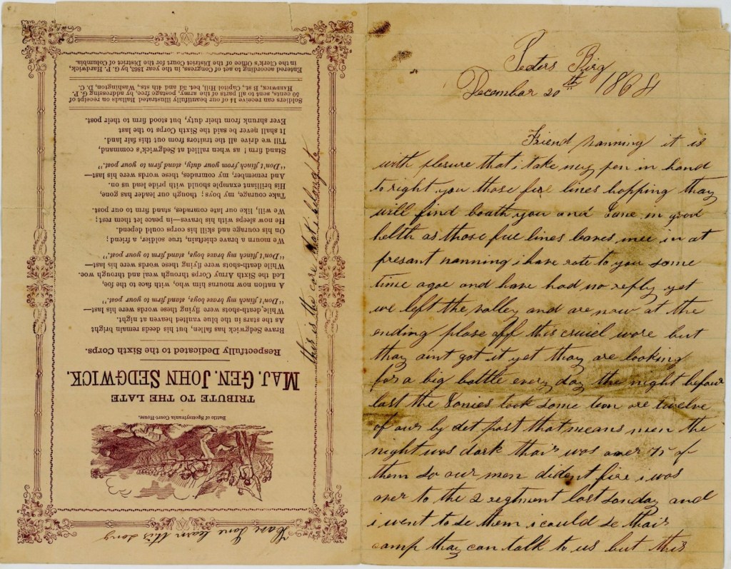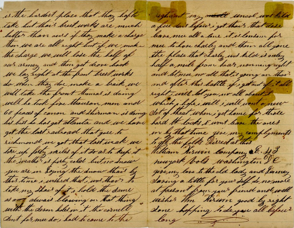 We left the Valley and are nowat the ending place of this cruel war but they ain’t got it yet. They are looking for a big battle every day. The night before last the Johnnies took some ten or twelve of our outpost—that means men. The night was dark. There was over 75 of them so our men didn’t fire. I was over to the 2nd Regiment last Sunday and I went to see them. I could see their camp. They can talk to us but this is the hardest place that they have to take but their breastworks are much better than ours. If they make a charge, then we are all right. But if we make the charge, we will lose the half of our army and then get drove back. We lay right at the front breastworks so when they do make a break, we will take the front.