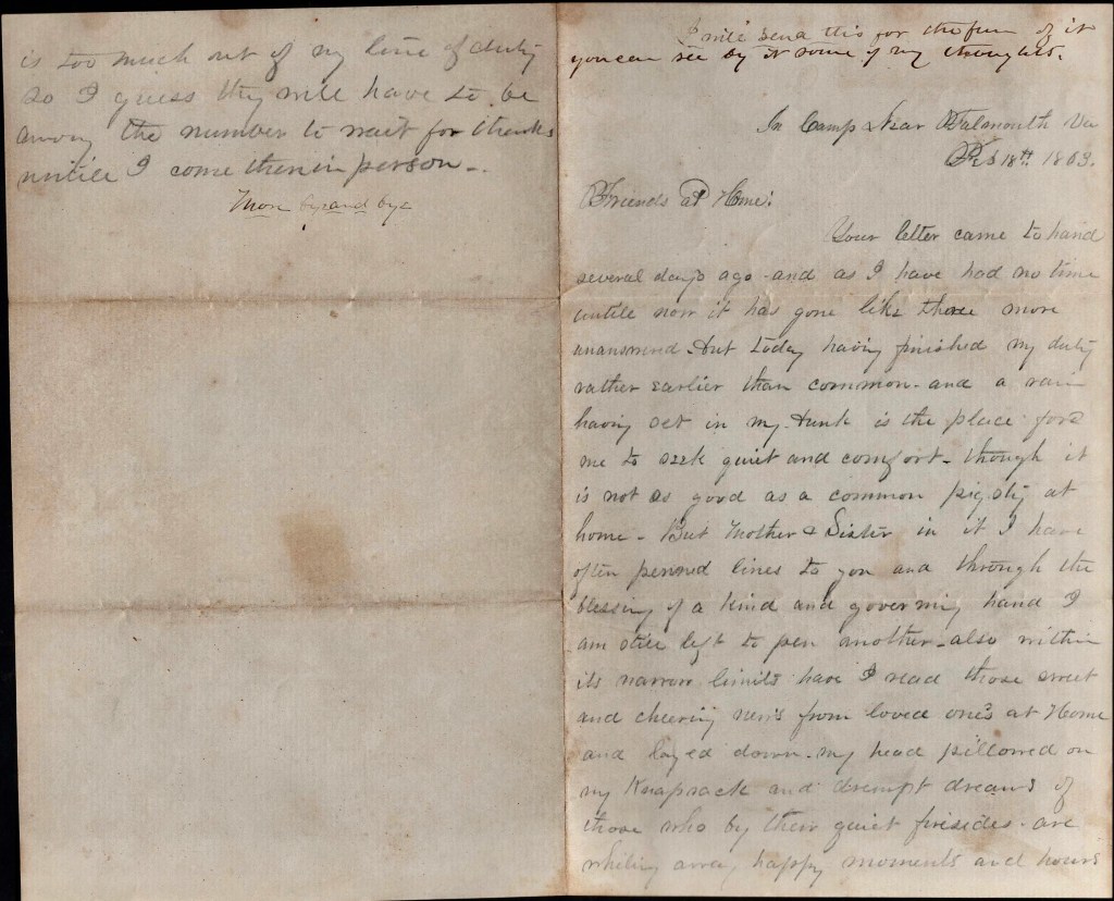 Your letter came to hand several days ago and as I have had no time until now, it has gone like three more unanswered. But today having finished my duty rather earlier than common and a rain having set in, my trunk is the place for me to seek quiet and comfort, tough it is not as good as a common pig sty at home. But Mother & Sister, in it I have often penned lines to you and through the blessing of a kind and governing hand, I am still left to pen another. Also within its narrow limits have I read those sweet and cheering news from loved ones at home and laid down my head pillowed in my knapsack and dreamt dreams of those who by their quiet firesides are whiling away happy moments and hours scarcely casting one thought of those here living the life of privation and even suffering. How long shall this last is the question that I am unable to answer, but sincerely hope not long, for being worn out and tired of such a life it is but misery to stay here, even when ones thoughts are allowed to stray back to times of old when by a cheerful fire the family circle was complete. But how many of these bright circles are broken? How many are caused to morn a link gone, never to be replaced or filled by another? Alas, it is sad even for us to think of. We who have become hardened to all kinds of sights and toughened to all exposure. Memory will cling like the woodbine to an ancient house hard to be disengaged.