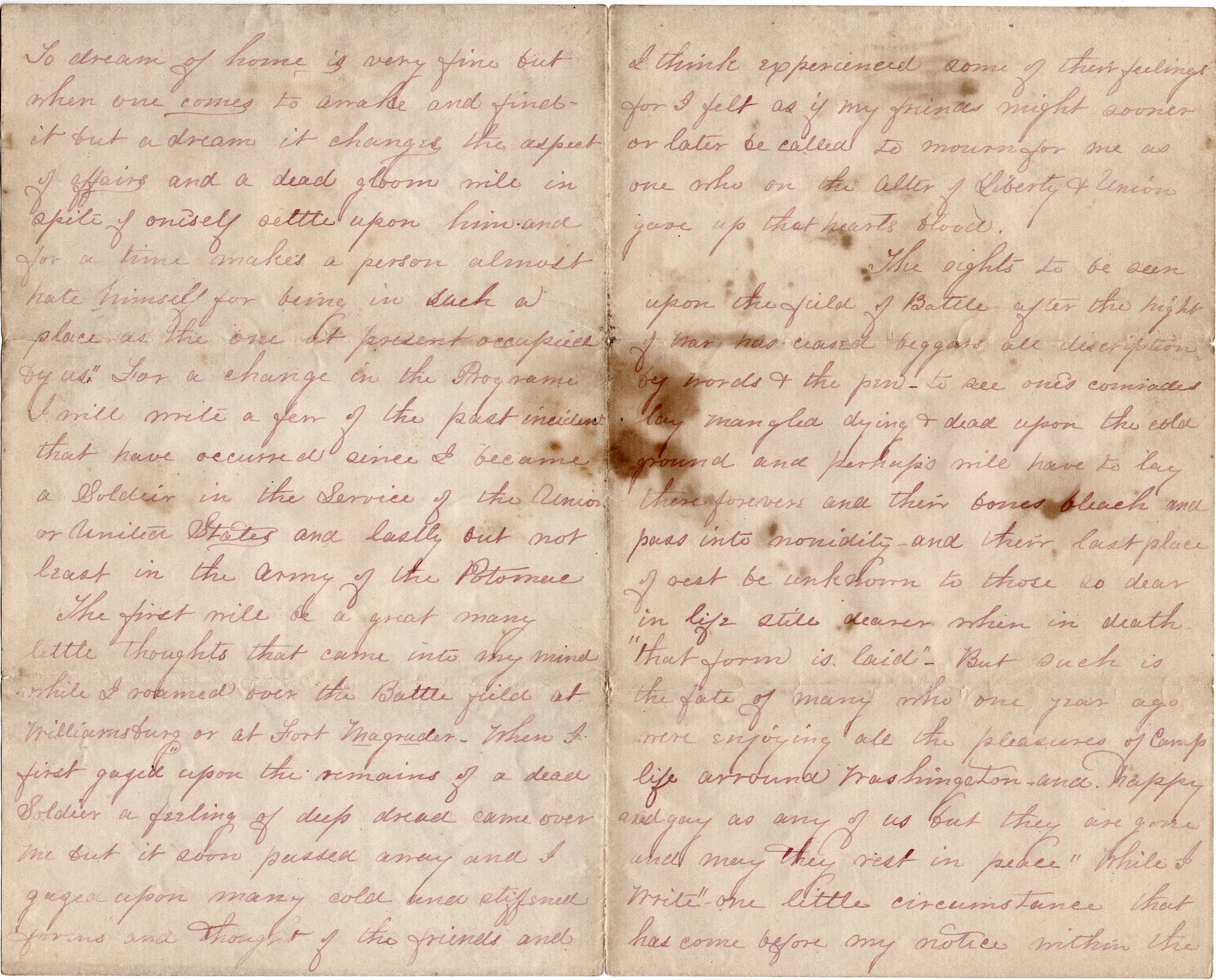 The first will be a great many little thoughts that came into my mind while I roamed over the Battlefield at Williamsburg or at Fort Magruder. When I first gazed upon the remains of a dead soldier, a feeling of deep dread came over me. But it soon passed away and I gazed upon many cold and stiffened forms and thought of the friends and I think experienced some of their feelings for I felt as if my friends might sooner or later be called to mourn for me as one who on the altar of Liberty & Union gave up that hearts blood.