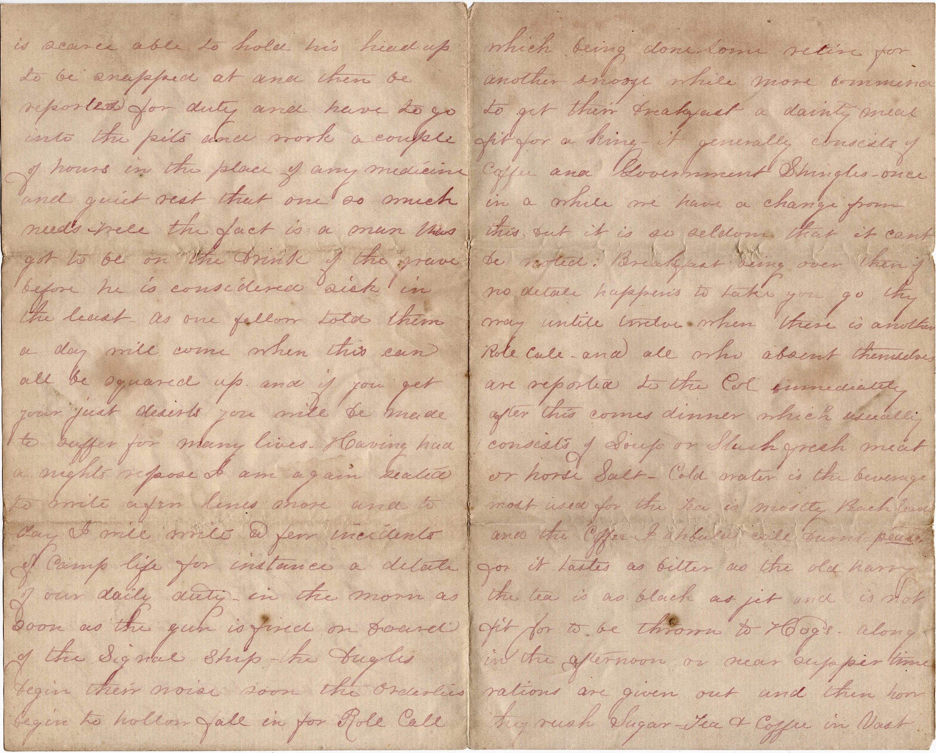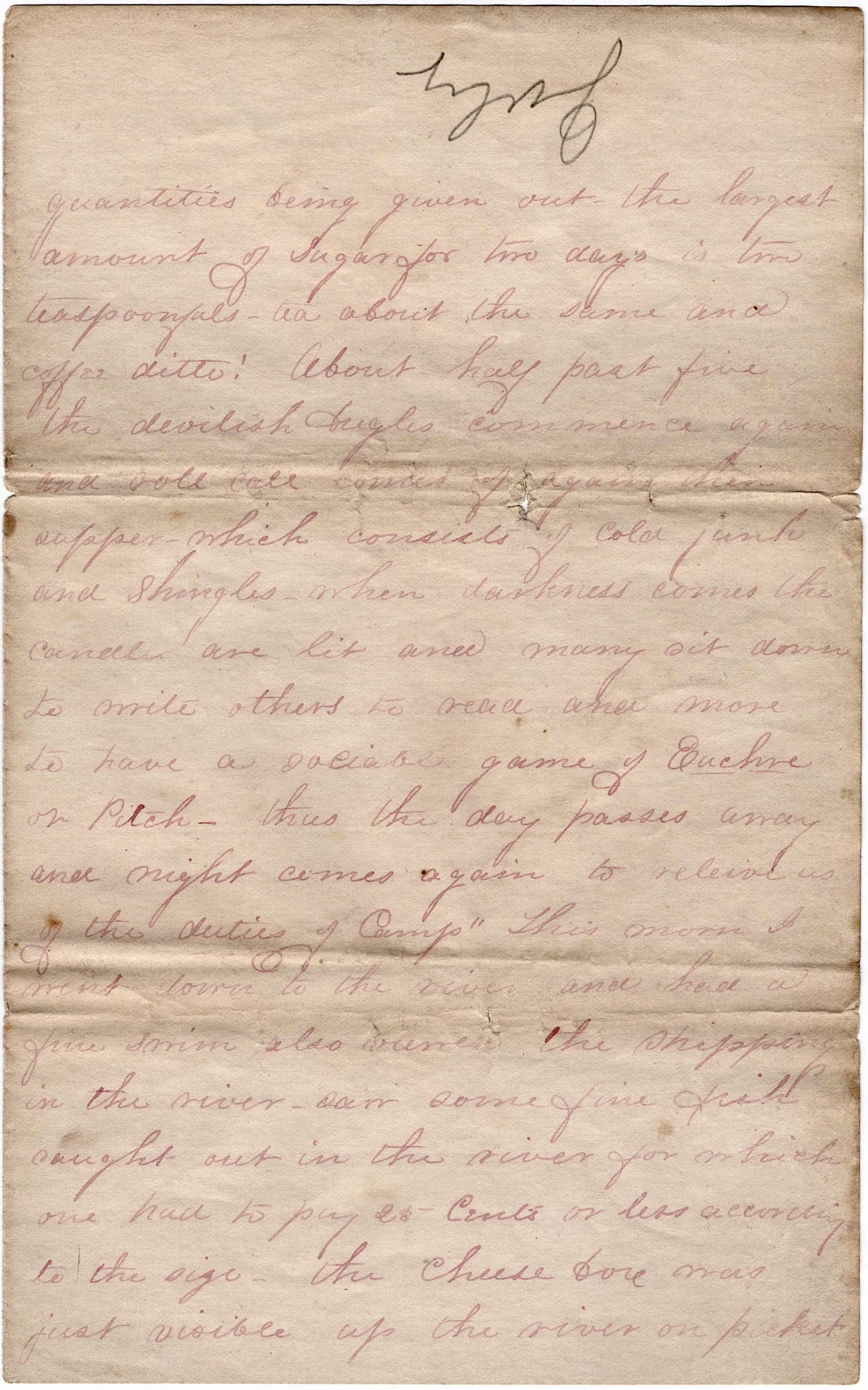 Breakfast being over, then, if no detail happens to take, you go thy way until twelve when there is another roll call and all who absent themselves are reported to the Colonel immediately. After this comes dinner which consists of soup or slush, fresh meat or horse salt, cold water is the beverage most used, for the tea is mostly peach leaves, and the coffee I should call burned peas, for it tastes as bitter as the Old Harry [Devil]. The tea is as black as jet and is not fit to be thrown to hogs. Along in the afternoon or near supper time, rations are given out and then how they rush, sugar, tea & coffee in vast quantities being given out. The largest amount of sugar for two days is two teaspoonfuls, tea about the same, and coffee ditto! About half past five, the devilish bugles commence again and roll call comes off again and then supper, which consists of cold junk and shingles. When darkness comes the candles are lit and many sit down to write, others to read, and more to have a social game of Euchre or Pitch. Thus the day passes away and night comes again to relieve us of duties of camp.