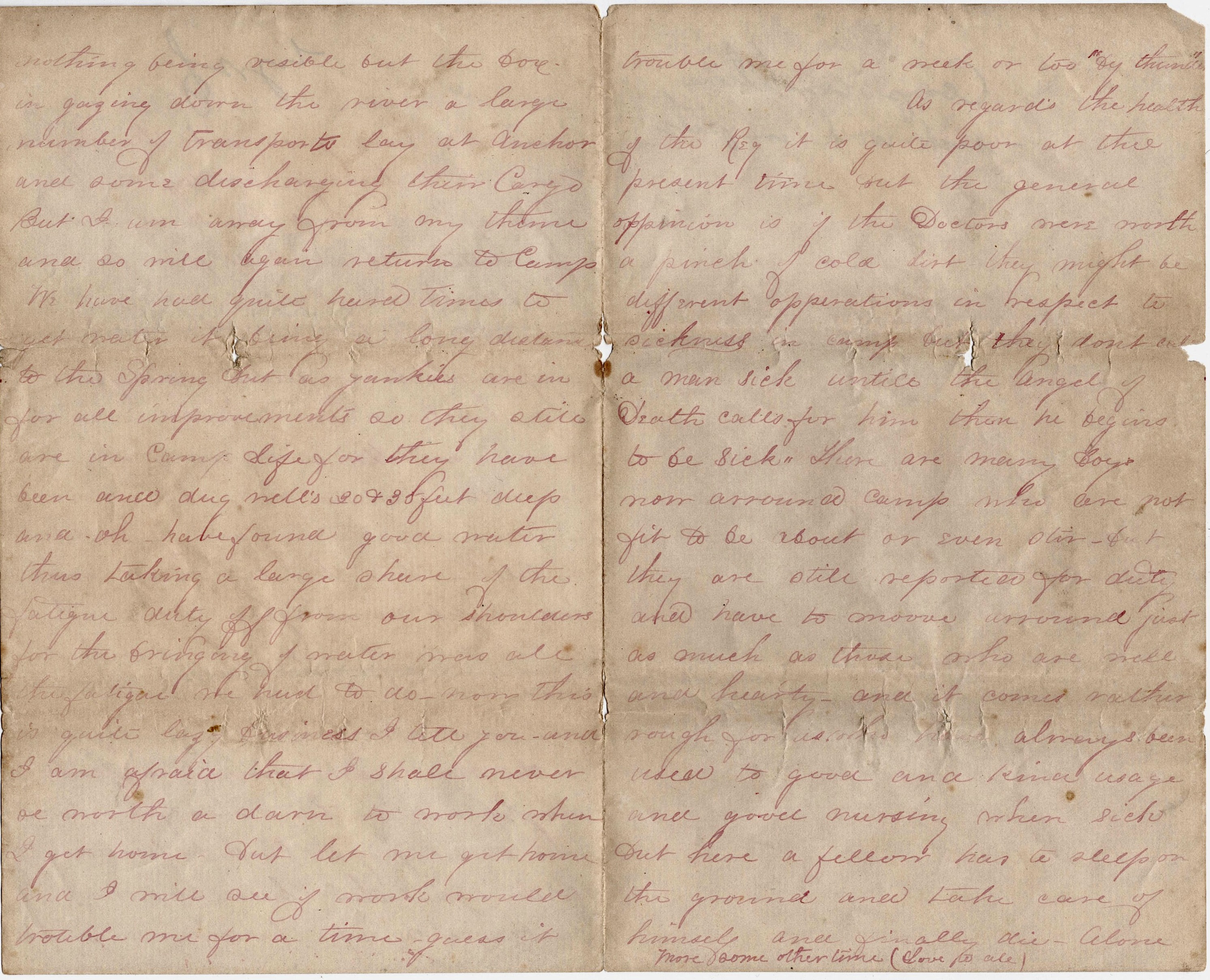 As regards the health of the regiment, it is quite poor at the present time but the general opinion is if the doctors were worth a pinch of cold dirt, they might be different operations in respect to sickness in camp. But they don’t call a man sick until the angel of death calls for him. Then he begins to be sick. There are many boys now around camp who are not fit to be about or even stir, but they are still reported for duty and have to move around just as much as those who are well and hearty, and it comes rather hard for us have always been used to good and kind usage and good nursing when sick. But here a fellow has to sleep on the ground and take care of himself and finally die—alone. More some other rime. (Love to all)