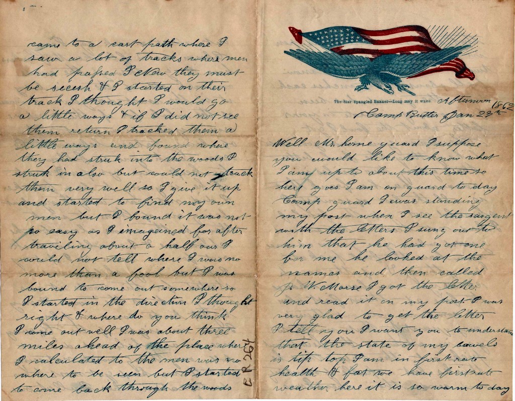 Well Mr. Home Guard, I suppose you would like to know what I am up to about this time so here goes. I am on guard today—camp guard. I was standing my post when I see the sergeant with the letters. I sung out to him that he had got one for me. He looked at the names and then called J. W. Morse! I got the letter and read it on my post. I was very glad to get the letter, I tell you. I want you to understand that the state of my bowels is tip top. I am in first rate health & fat.