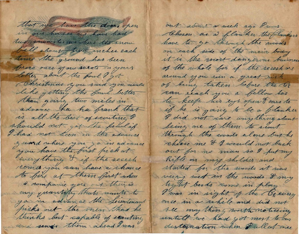 I was out about a week ago. I was chosen as a flanker. The flankers have to go through the woods on each side of the main body. It is the most dangerous business of the whole for if the secesh are around, you run a great risk of being taken before the company can reach you. A fellow has to keep his eyes open & ears too if he is going to be a flanker. I did not care anything about being one of them to scout through the woods alone but he chose me & I would not back out for no man so I put my rifle on my shoulder and started for the woods. It was very wet in the woods & my tight boots come in play. I was in sight of the company every once in a while and did not see anything worth noticing until we had got most to our destination when I, all at once, came to a cart path where I saw a lot of tracks where men had passed. I knew they must be secesh & I started on their track. I thought I would go a little ways & if I did not see them return.