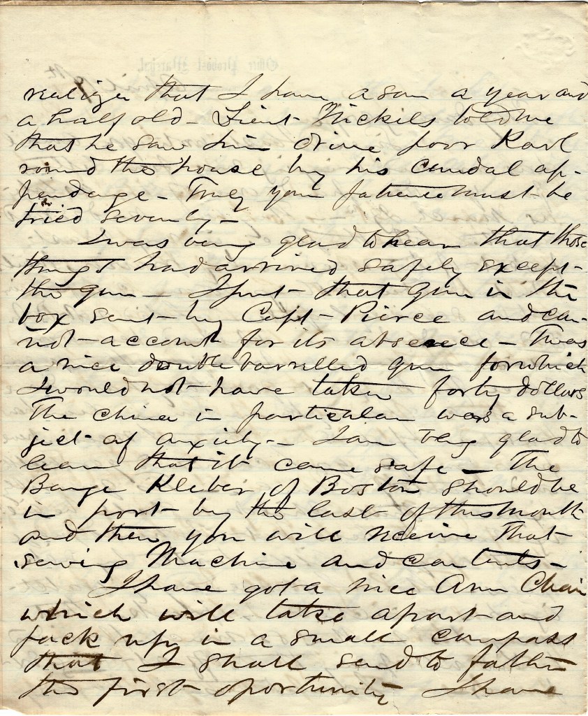 I was very glad to hear that those things had arrived safely except the gun. I put that gun in the box sent by Capt. Pierce and cannot account for its absence. Twas a nice, double barreled gun for which I would not have taken forty dollars. The china in particular was a subject of anxiety. I am very glad to learn that it came safe. The Barque Kleber of Boston should be in port by the last of this month and then you will receive that sewing machine and contents. I have got a nice arm chair which will take apart and pack up in a small compass that I shall send to father the first opportunity I have and perhaps I may send that small reed organ to you by Kt. Prescott who has resigned and will probably go home. I have not heard yet from the man who owns it but hope to before Lt. goes home.