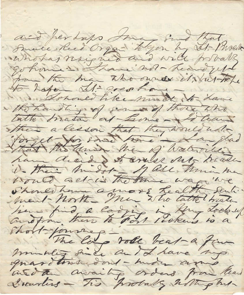 I should like much to have the handling of some of those who talk treason at home to learn them a lesson that they would not forget for some time. I am glad that the Union men of Waterville have decided to crush out treason in their midst. If all Union men would act in the same way, we should have a more healthy sentiment North. Men who talk treason here find a lodging in my lock up and from there to Fort Pickens is a short journey.